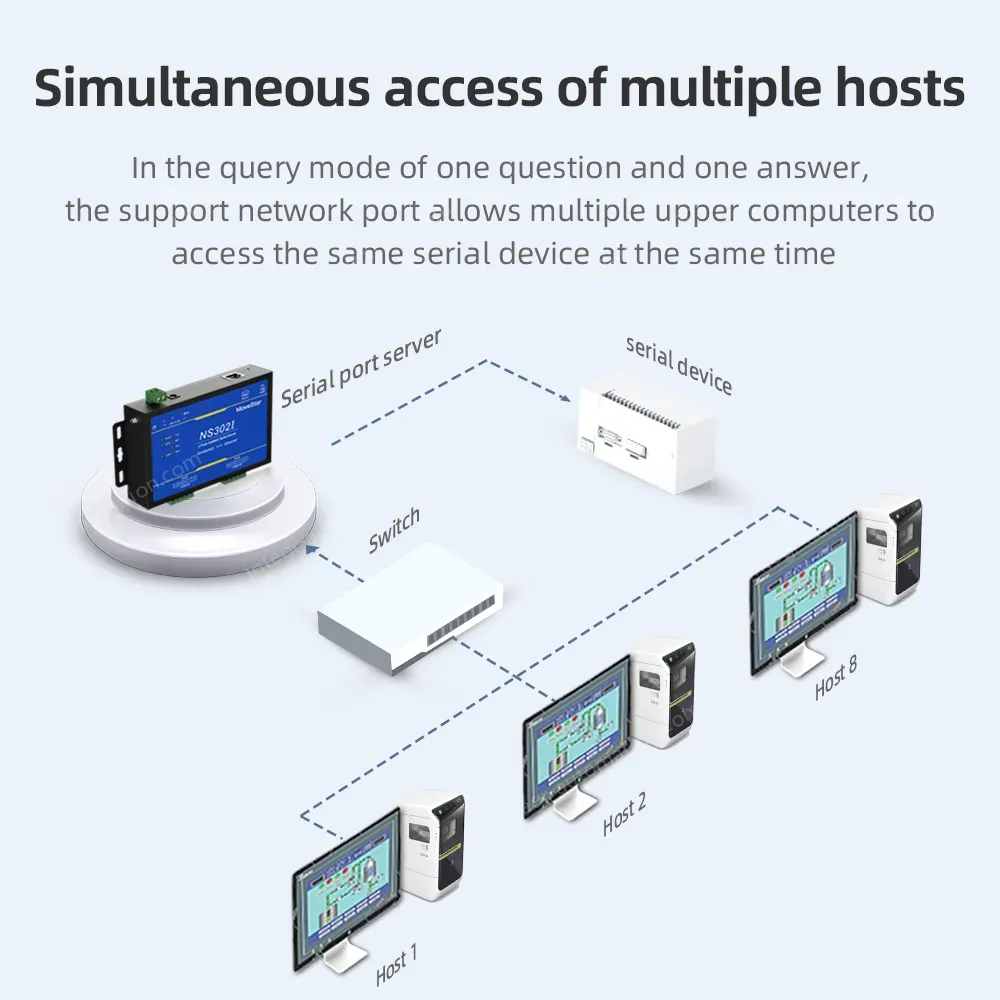 Industrial serial port server series products, mainly realize the data transmission between Ethernet and serial port (RS-232/RS-485/RS-422), it integrates the TCP/IP protocol stack, RS-232/RS-485/RS-422 devices that are not connected to the Internet can also be easily, flexibly and quickly connected to Ethernet. The series of products use high-performance ARM chip to ensure stable data transmission; Support a variety of working modes to meet different application requirements; Excellent anti-interference performance, suitable for harsh industrial environments.
